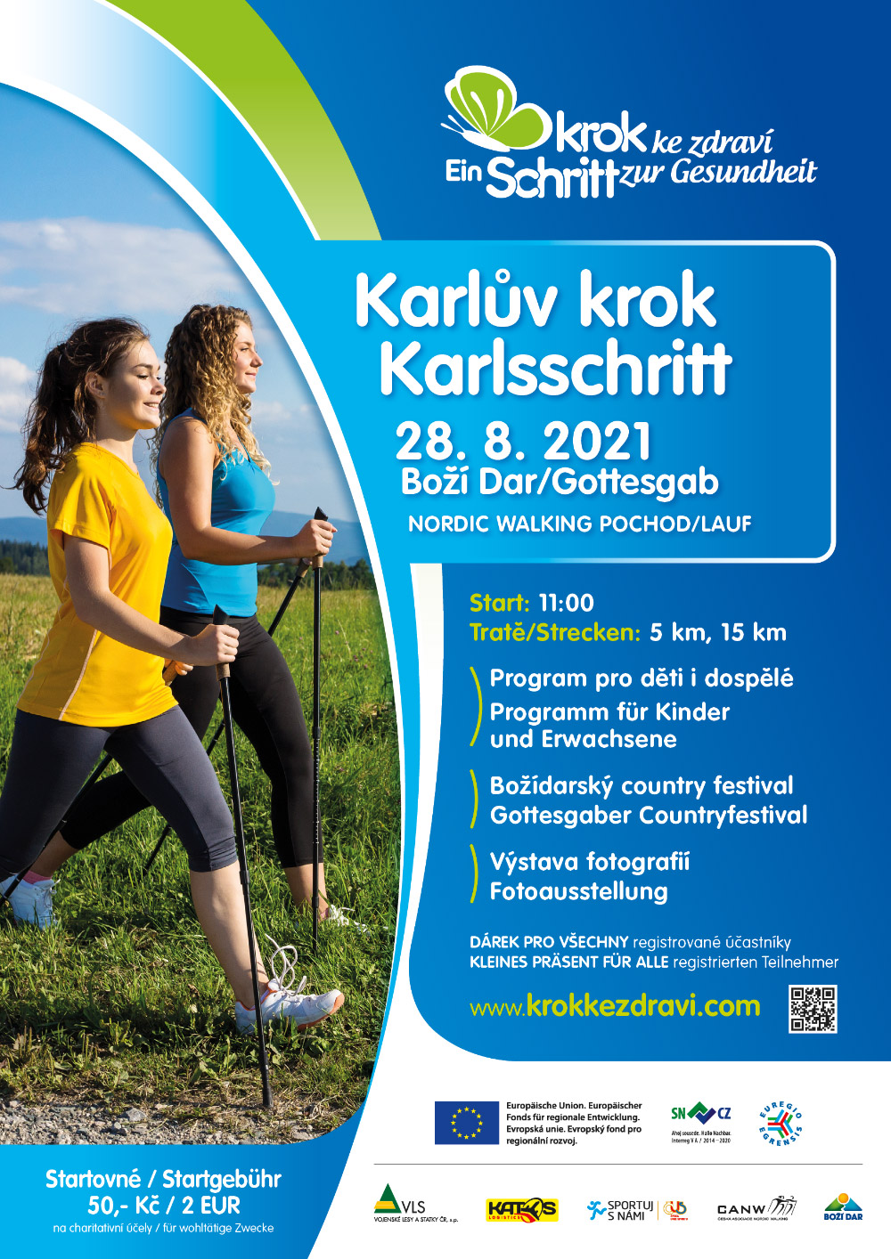 Karlův krok – na krok za zdravím se vydaly téměř dvě stovky účastníků. Po roční koronavirové pauze se na Boží Dar v sobotu 28.srpna vrátili příznivci aktivity nordic walkingu a zdravého životního stylu. Téměř dvě stovky českých i německých účastníků neodradilo ani božídarské počasí s teplotami kolem 10 stupňů a aprílovými přeháňkami a vyrazily na pochod. Připraveny byly tratě 5 a 15 kilometrů po Ježíškově cestě. Nejlépe si s kratší distancí poradili Zdeněk Mikšík a Eva Jindrová. Na 15 kilometrové trati se sváděl boj o zlato až do posledních metrů před cílem. Lenku Lumpeovou ve finiši zradil materiál a zlomená walkingová hůl znamenala „až“ 2. místo v absolutním pořadí a samozřejmě prvenství v kategorii žen. Absolutním vítězem na 15 km se stal Jiří Mikšík, což nikoho nepřekvapilo, protože je to favorit každého ročníku. Mikšíkovskou rodinnou sbírku doplnila bronzová maminka Hana Mikšíková. Sportuj s námi! Heslo, které platilo pro všechny rodiny, které se akce Krok ke zdraví a především pochodu Karlův krok 2021 zúčastnili a pochod brali jako příjemnou vycházku krušnohorskou přírodou. Všichni návštěvníci svojí registrací na této tradiční akci podpořili nejen své zdraví, ale také přispěli registračním poplatkem na skvělou věc! Šek v hodnotě 15.500 Kč byl v rámci vyhlášení vítězů předán jménem všech účastníků spolku SK Kontakt Karlovy Vary na podporu sportovní činnosti handicapované mládeže. 17.ročník této akce měl také bohatý doprovodný program: Božídarský country festiválek, lékařskou poradnu, půjčovnu Leki s odbornou instruktáží a malířskou dílničku pro děti. A co malovaly? Především sluníčka. Akci Krok ke zdraví podpořil, Evropský fond pro regionální rozvoj, Město Boží Dar, Česká unie sportu a řada dalších partnerů. Sezóna zábavných a tematických pochodů na Božím Daru pokračuje hned 11.září Pochodem Na Dětský den do Oberwiesenthalu. Výsledky pochodu Karlův krok a bohatá fotogalerie akce Krok ke zdraví na www.krokkezdravi.com. Více informací k nadcházející akci 11.9.2021 na www.detskyden2020.eu.